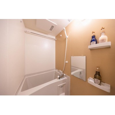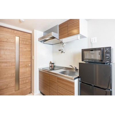 Comfortable Living: FDS Serene in Osaka offers a one-bedroom apartment with a living room. The property includes air-conditioning, a washing machine, and a fully equipped kitchen with a refrigerator, microwave, and stovetop.