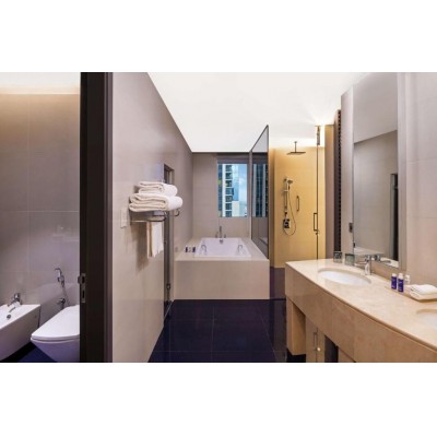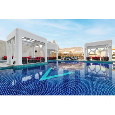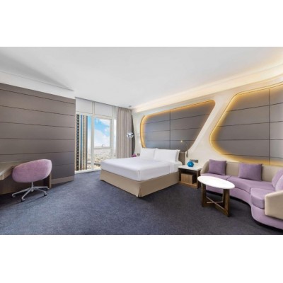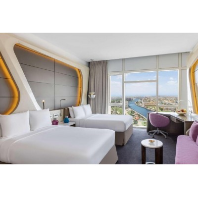 With 356 guest rooms including 76 suites, check in, in the V Hub on the seventh floor with enticing Dubai Canal views and ensconce yourself in our round signature-bedded suites on its extravagant with either Dubai Water Canal, Sheikh Zayed Road or pool views. Party it up at V Hotel Dubai's signature Penthouse, located on the top floor with breathtaking views of the Dubai Water Canal with a DJ area, stage to showcase the groovy moves, private Jacuzzi to let loose and much more. Dance in the clouds in V Hotel Dubai's Sky Villa, the perfect two-level runway is the perfect party destination for milestone celebrations. Enjoy the V Hub, the home to V Lounge, Sunsets are never out of fashion in this chic setting with enchanting views from the seventh floor. Beat the heat at V Deck, an urban poolside spot, sleekly lavished with all the fundamentals of stylish contemporary deck cabanas, DJ booth and tantalizing cocktails. Stop by Level Seven, a culinary Crossroads of the vibrant flavors and a lively atmosphere, Zoco delivers a different kind of dining experience with a Mexican cuisine taste. Relish in a casual dining at Level 7, a unique hide out on the 7th floor, while enjoying live cooking stations. The rooms are spacious with futuristic style, seating areas and satellite flat screen TVs. The bathrooms are like nothing you've seen with the bathtub set in an open plan fashion. Guests will enjoy use of the state-of-the-art fitness center which offers equipment for cardio, weights and EMS Training. With more than 1,000 square meters of event space and meeting rooms, V Hotel Dubai orchestrates fully adaptable conference equipment and world-class audio-visual facilities to set the stage for lively and spectacular presentations. V Hotel Dubai is the home to the number one water-themed show, La Perle. Complimentary valet parking is available for all guests. A free shuttle bus to Dubai Mall, private beach is available.