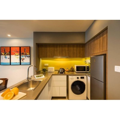 Adorned in neutral shades, all non-smoking rooms are fitted with a wardrobe and ironing facilities. Ample rooms also feature a seating area with sofa and satellite flat-screen TV. Fully-equipped kitchenette with dining area or a washing machine are available in selected rooms. En suite bathroom comes with shower facility and a hairdryer. Extras include free toiletries, slippers and towels.