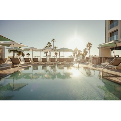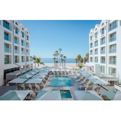 The hotel features an expansive fitness center, indoor and outdoor meeting and event spaces, and immediate proximity to Santa Monica's iconic attractions.
